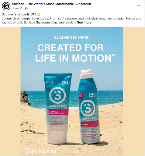 Through comprehensive competitive analysis and targeted audience research, we identified a powerful growth opportunity for Surface. The exceptional quality of Surface’s products — microplastics free, non-toxic, 80-minute water resistant, etc. — provided a credible foundation for pivoting from a purely surf-focused sunscreen brand to more broadly appealing to active, sporty lifestyle consumers. This significantly expanded their market potential beyond the beach.